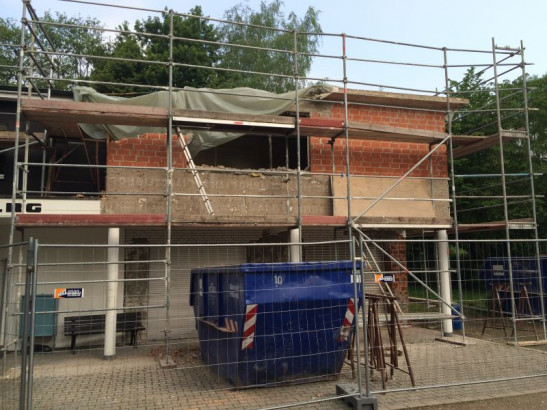 Das komplette Erdgeschoss ist nun gedämmt. Das Gerüst wird schon zurückgebaut und gibt den Blick frei auf den Verwaltungs- und Schulungsbereich. Während sich die Arbeiten an der Fassade nun langsam dem Ziel nähern, sind die Handwerker im Innenbereich noch sehr fleißig. Für die neue Küche musste eine Wand weichen, die Türen sind größtenteils entfernt. Sie werden durch moderne Türen ersetzt, die auch den neuesten Brandschutzvorgaben entsprechen. ... Mehr erfahren