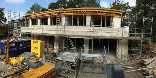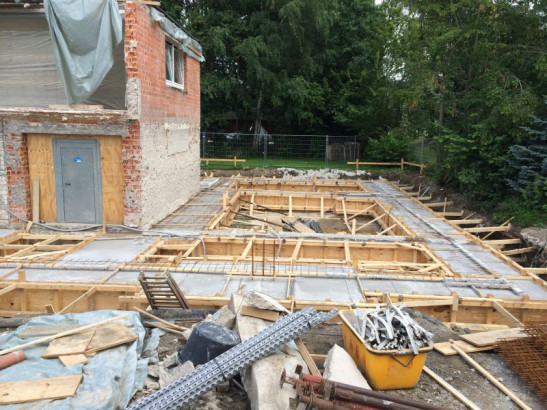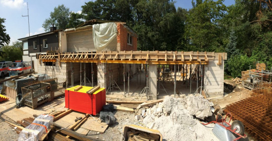 Der Rohbau ist nun fast fertig. In der vergangenen Woche wurde die Decke des ersten Obergeschosses gegossen. Mittlerweile ist die Verschalung schon entfernt worden, so dass die Betondecke zu sehen ist. Auf ihr wird dann noch vom Zimmermann ein flaches Walmdach aufgebracht, damit das Wasser ordentlich abfließen kann. Nun müssen noch die Durchbrüche zum "Altgebäude" vorbereitet und dann auch umgesetzt werden. Damit erhält der Anbau seinen Anschluss an das restliche Gebäude. ... Mehr erfahren