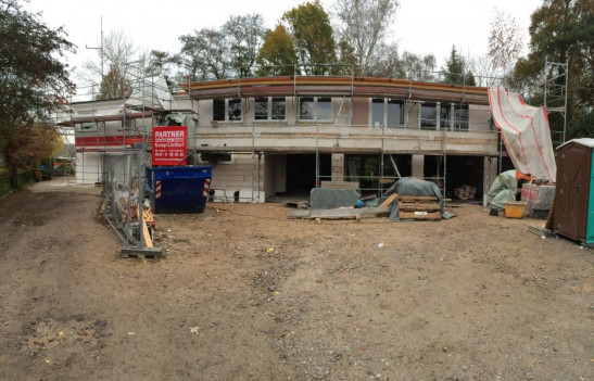 Das gute Wetter im Oktober hat die Fassadenarbeiten begünstigt. Mittlerweile ist der gesamte Altbau neu gedämmt, verputzt und kaum noch wiederzuerkennen. Am Anbau laufen noch die Arbeiten an der Verklinkerung, die links und rechts neben den Toren Akzente setzt und die Nordseite des Erdgeschosses abschließen wird. An- und Altbau verschmelzen optisch immer mehr zu einer Einheit. Auch die Dachdecker haben den neuen Dachstuhl bereits aufgestellt und an den Altbestand angepasst. Wir können es kaum noch erwarten unser neues, altes Domizil wieder vollständig in Beschlag zu nehmen. ... Mehr erfahren